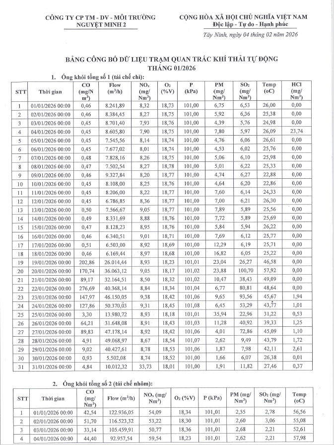 Công ty Nguyệt Minh 2 công khai thông tin dữ liệu trạm quan trắc khí thải tự động tháng 1/2026