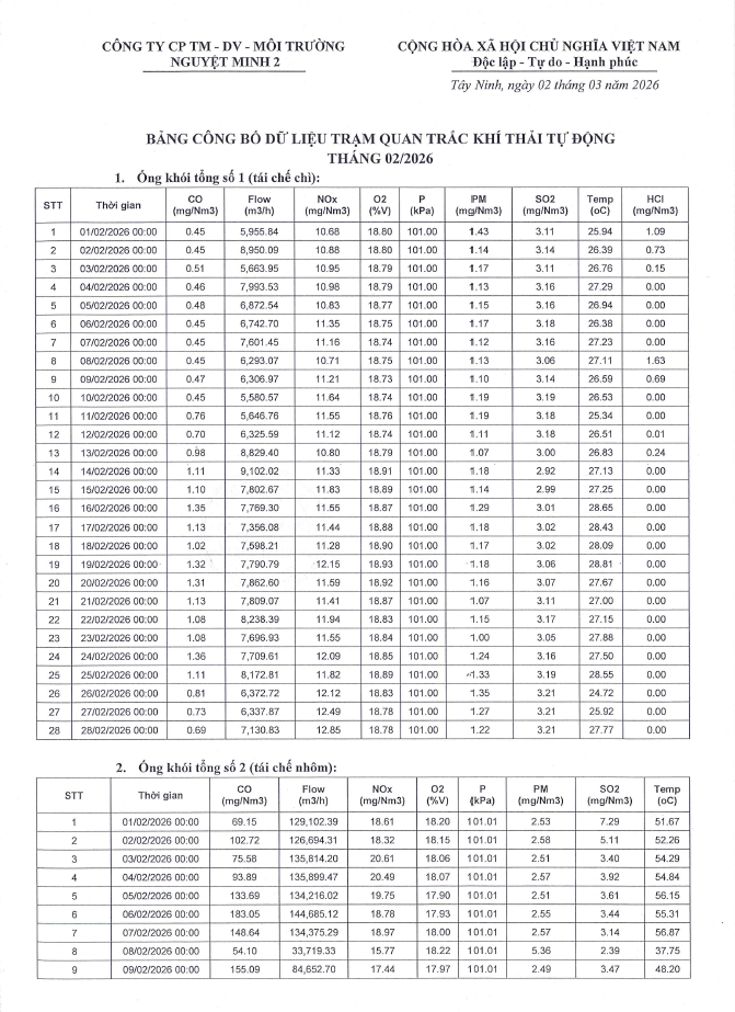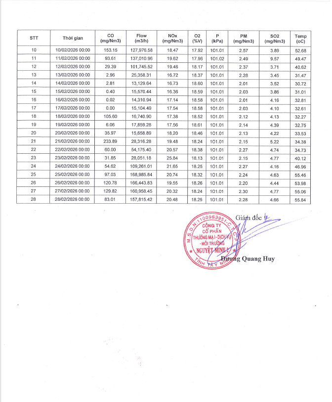 Công ty Nguyệt Minh 2 công khai thông tin dữ liệu trạm quan trắc khí thải tự động tháng 2/2026