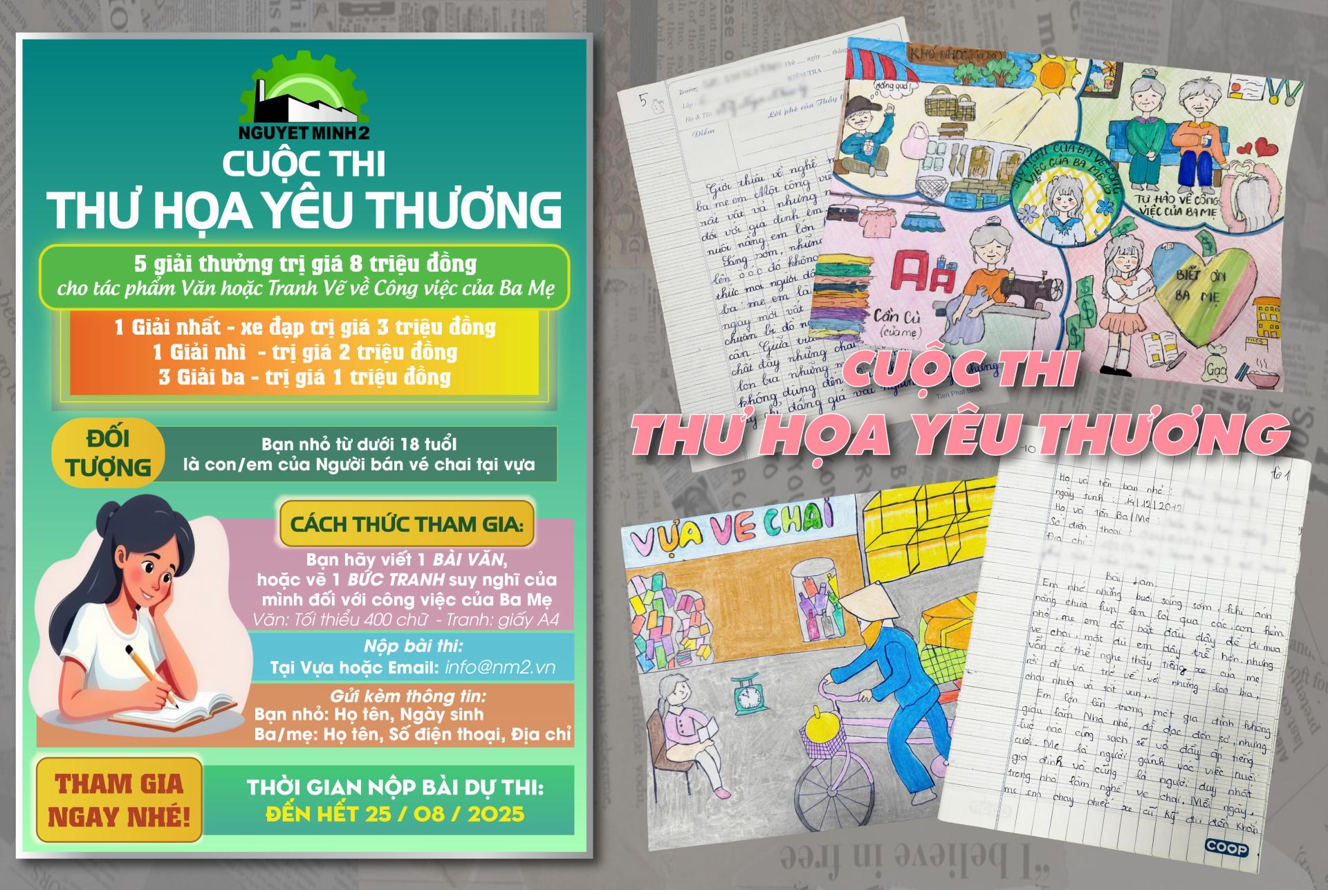 Với mong muốn mang đến một sân chơi bổ ích và giàu ý nghĩa cho thế hệ trẻ, Nguyệt Minh 2 đã tổ chức cuộc thi “Thư họa yêu thương”. Đây là dịp để các em nhỏ thể hiện tình cảm, sự thấu hiểu và lòng tự hào dành cho công việc của ba mẹ thông qua những trang văn và bức tranh hồn nhiên.
